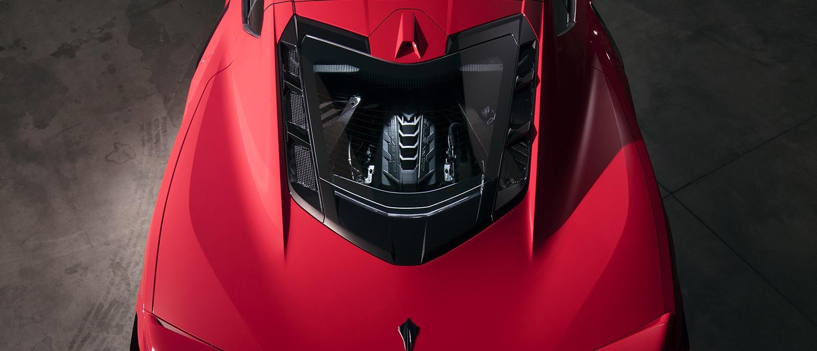 - The all-new LT2 V8 engine is visible through a rear hatch window